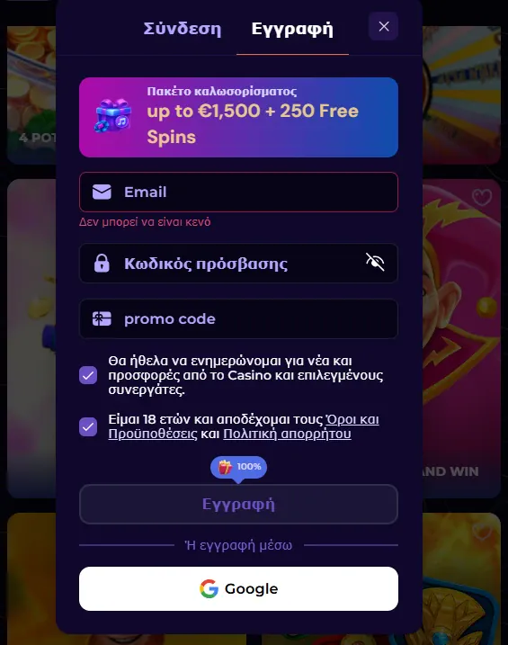 Κάντε κλικ στο Εγγραφή, εισαγάγετε το email, τα προσωπικά σας στοιχεία και το προτιμώμενο νόμισμα, αποδεχθείτε τους όρους και επιβεβαιώστε το email σας. Το SlotsDJ Casino προσφέρει επίσης επιλογή εγγραφής Google με ένα κλικ στην οθόνη εγγραφής.